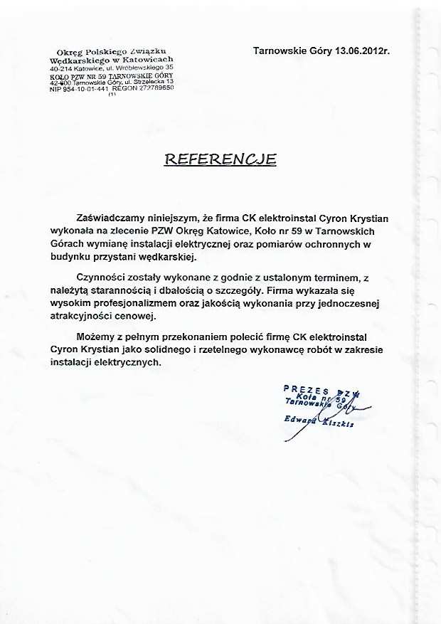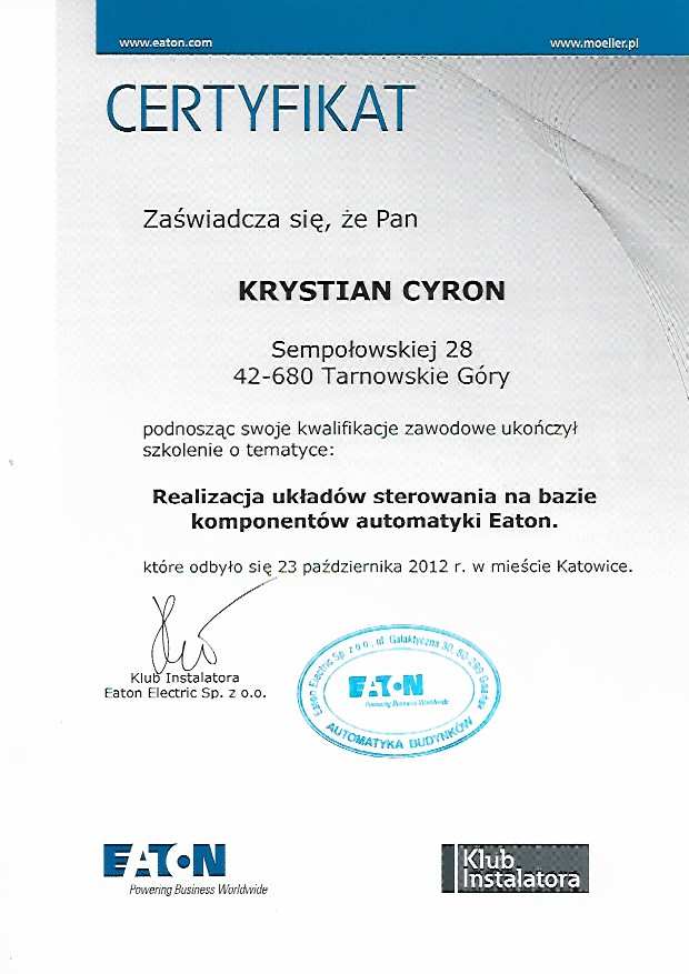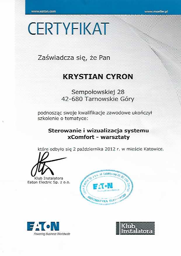 Zadowolenie naszych klientów to najlepsza rekomendacja. Od lat realizujemy zlecenia dla osób prywatnych, firm i instytucji, dostarczając niezawodne rozwiązania z zakresu instalacji elektrycznych, automatyki i systemów niskoprądowych. Dysponujemy niezbędnymi uprawnieniami SEP, certyfikatami produktowymi oraz szkoleniami branżowymi, które potwierdzają nasze kompetencje i zgodność z aktualnymi normami technicznymi. Dziękujemy za zaufanie wszystkim, którzy zdecydowali się powierzyć nam swoje instalacje. Poniżej prezentujemy wybrane opinie klientów, listy referencyjne oraz certyfikaty, które potwierdzają nasz profesjonalizm i wysoką jakość usług. Dzięki zaangażowaniu i doświadczeniu z powodzeniem realizujemy zarówno standardowe zlecenia, jak i skomplikowane systemy. Obszar działania obejmuje następujące miejscowości Tarnowskie Góry, Zabrze, Gliwice, Bytom, Piekary Śląskie, Pyskowice, Tworóg, Świerklaniec, Miasteczko Śląskie, Zbrosławice czy Lubliniec. Zapraszamy do zapoznania się z galerią naszych prac.